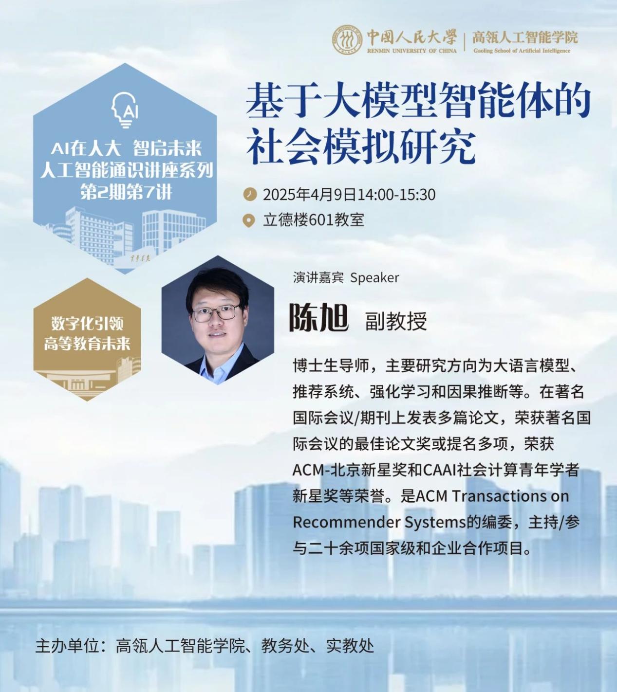 嘉宾简介:陈旭,博士生导师,主要研究方向为大语言模型、推荐系统、强化学习和因果推断等。在著名国际会议/期刊上发表多篇论文,荣获著名国际会议的最佳论文奖或提名多项,荣获ACM-北京新星奖和CAAI社会计算青年学者新星奖等荣誉,是ACM Transactions onRecommender Systems的编委,主持/参与二十余项国家级和企业合作项目。