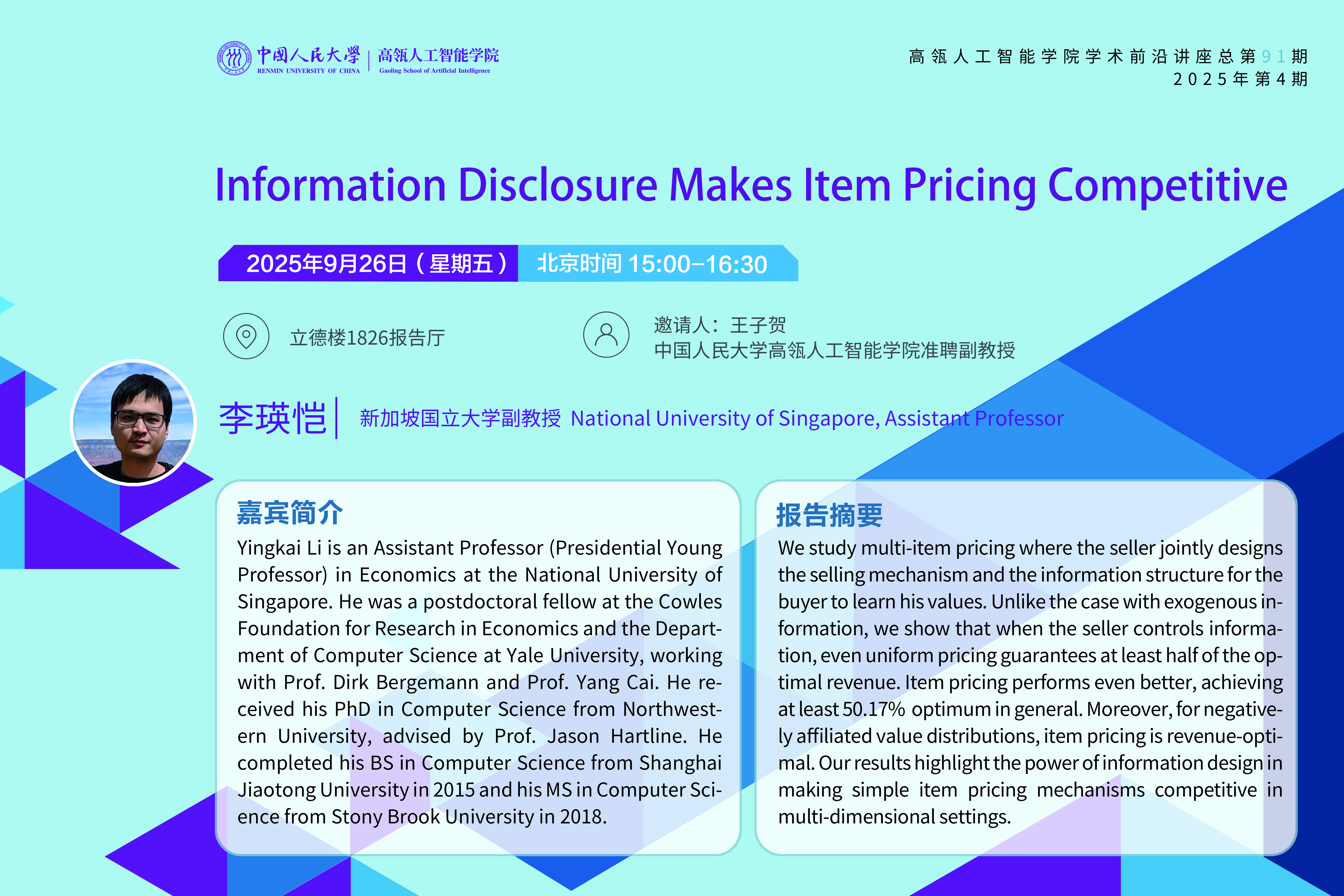 报告人简介:Yingkai Li is an Assistant Professor (Presidential Young Professor) in Economics at the National University of Singapore. He was a postdoctoral fellow at the Cowles Foundation for Research in Economics and the Department of Computer Science at Yale University, working with Prof. Dirk Bergemann and Prof. Yang Cai. He received his PhD in Computer Science from Northwestern University, advised by Prof. Jason Hartline. He completed his BS in Computer Science from Shanghai Jiaotong University in 2015 and his MS in Computer Science from Stony Brook University in 2018.