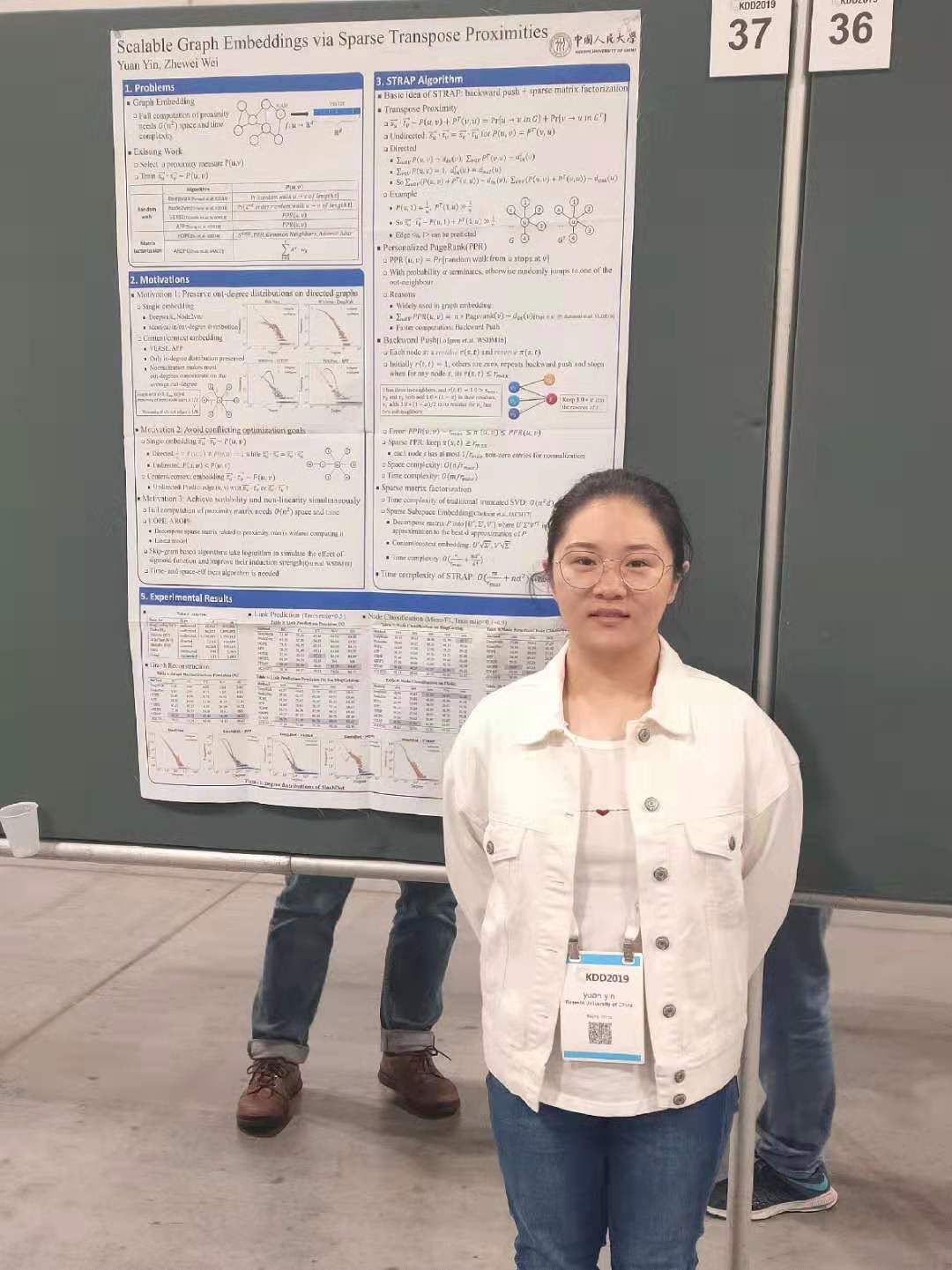 8月6日,殷源做题为“Scalable Graph Embeddings via Sparse Transpose Proximities”的论文报告。该论文设计了一种高效的图嵌入算法,该算法可以在线性时间内返回大规模网络的图嵌入向量。殷源是论文的第一作者,魏哲巍教授是通讯作者。
