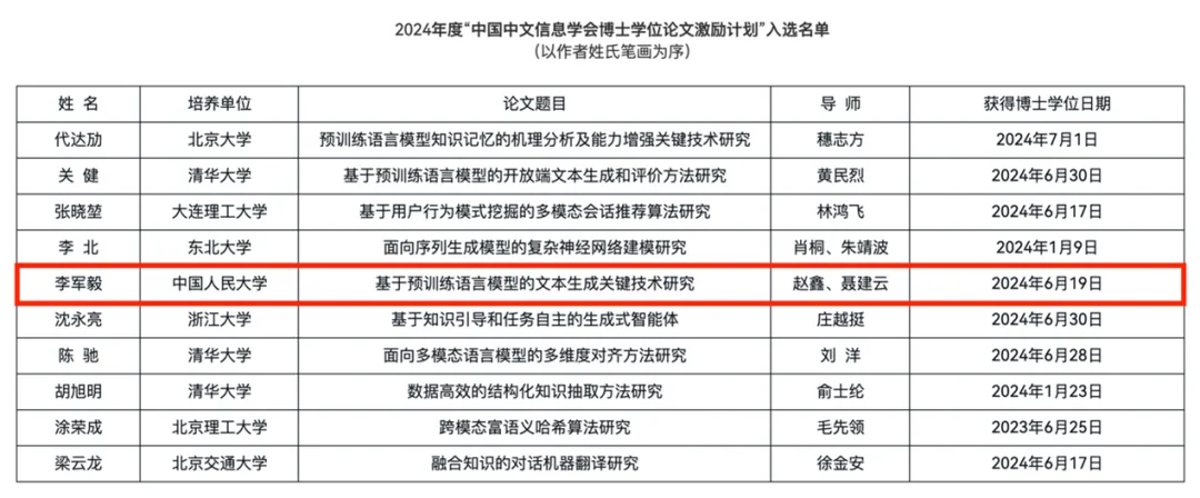 近日,中国人民大学高瓴人工智能学院李军毅的博士学位论文《基于预训练语言模型的文本生成关键技术研究》入选2024年中国中文信息学会“博士学位论文激励计划”,李军毅的指导教师为人大高瓴人工智能学院赵鑫教授和加拿大蒙特利尔大学聂建云教授。