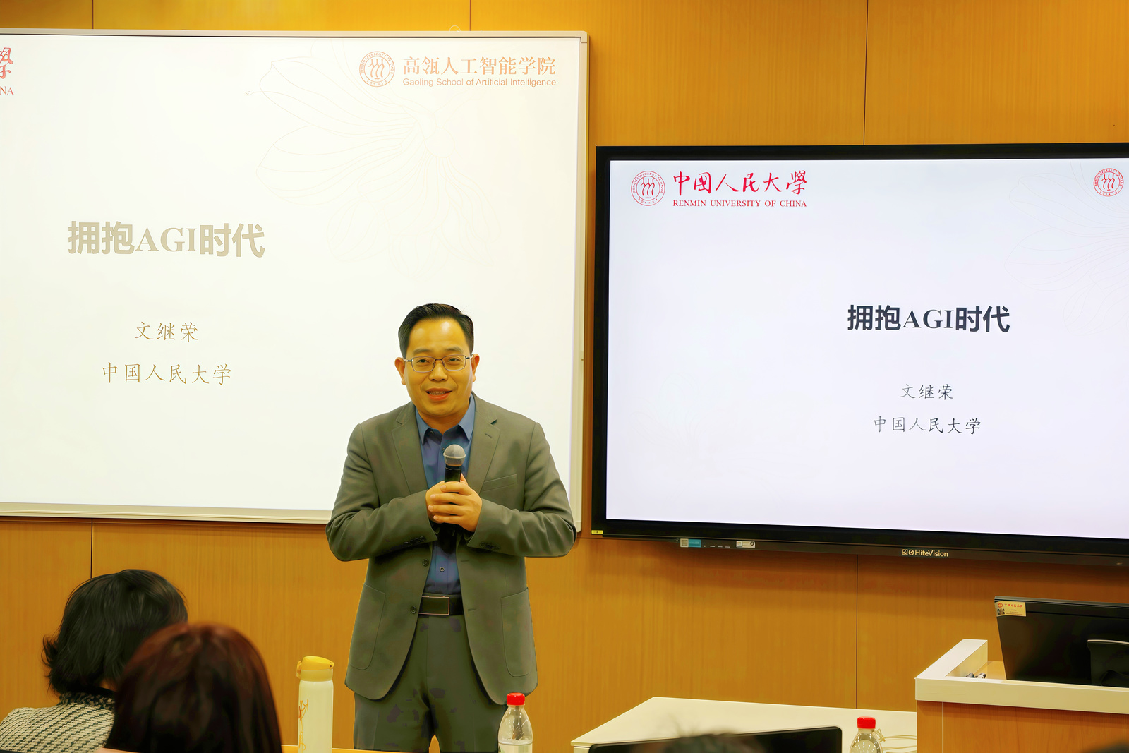 2025年2月20日下午,由中国人民大学高瓴人工智能学院、教务处、实验室管理与教学条件保障处主办的“AI在人大,智启未来”人工智能系列讲座第二期第1讲在立德楼601教室举办。中国人民大学党委常委、副校长冯仕政出席并致辞,教务处处长吴健主持讲座。高瓴人工智能学院执行院长文继荣教授首讲“拥抱AGI时代”。来自全校各学院(系)、书院和苏州校区的250余名师生参加讲座,共同开启新学期人工智能教育新篇章。