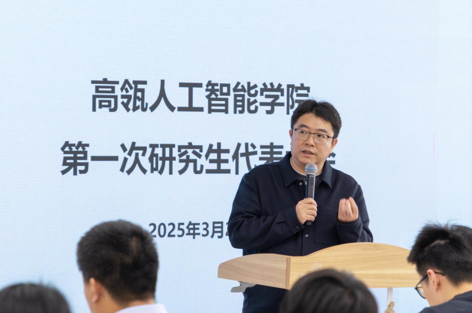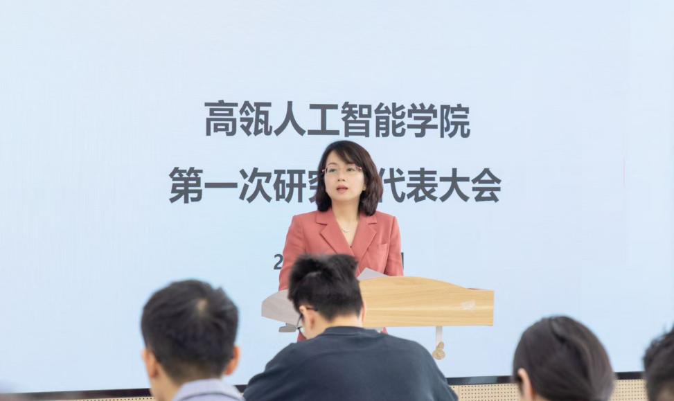 高瓴人工智能学院党委书记李艳丽致辞。她表示,学院自2019年成立以来,始终坚持以习近平新时代中国特色社会主义思想为指导,结合理工科学生思维特点和人工智能专业特色,深化“三全育人”综合改革,全面推进“五育并举”,着力培养全面发展的高素质人才。第一次研究生代表大会的召开是学院学生自治组织建设的重要时刻,希望研究生会作为学院和研究生之间的联系纽带,始终坚持服务同学的核心职责,传递同学心声,凝聚发展共识,通过理论学习、实践活动、榜样引领等多种形式,引导研究生坚定科技报国的理想信念,把握国家发展脉搏,关注科技前沿和社会需求,不断拓宽视野,勇挑时代重任。