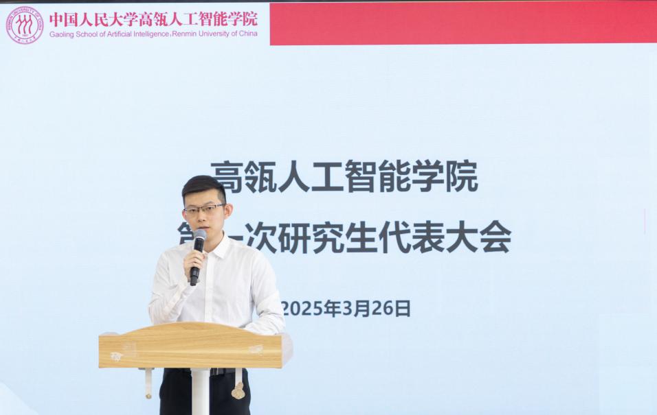 2025年3月26日下午,中国人民大学高瓴人工智能学院第一次研究生代表大会在立德楼1826报告厅召开。高瓴人工智能学院党委书记李艳丽、执行院长文继荣、党委副书记张育铭出席会议,校研究生会主席团成员花培严受邀参会。