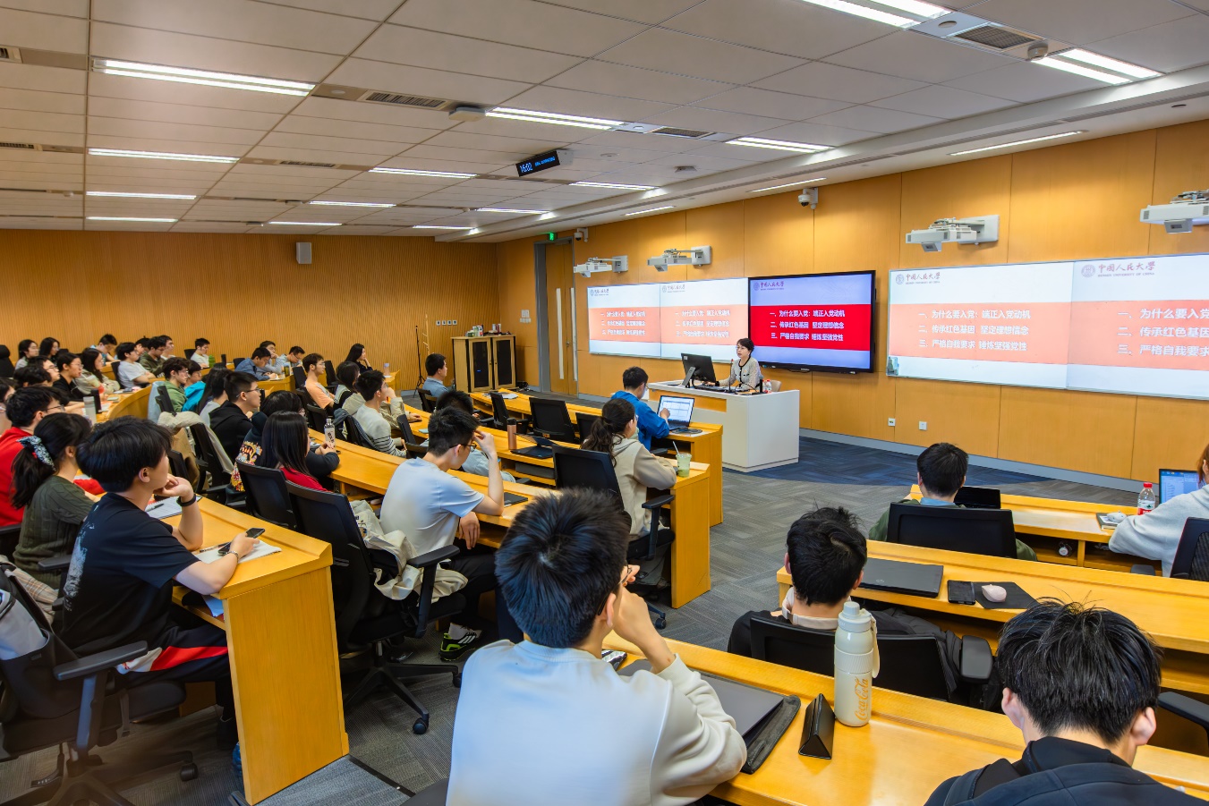 从“为什么要入党”这一根本问题出发,结合钱学森、雷锋、焦裕禄等优秀共产党员的入党历程,李艳丽指出,入党不仅仅是指在组织上入党,更要从思想上入党,每位同学都应该深入思考自己的入党动机。接着,李艳丽从旗帜引领、思想根基、信仰追求、人民立场、优良作风、真抓实干等方面回顾了中国共产党百年辉煌的历史经验,深刻阐述了中国共产党人“为中国人民谋幸福、为中华民族谋复兴”的初心和使命。随后,李艳丽带领同学们认真学习了习近平总书记致中国人民大学建校80周年贺信和习近平总书记2022年4月25日到中国人民大学考察调研时重要讲话精神,与同学们一起回顾“战火中办学”的红色校史,通过一张张老照片,她深情讲述了“从延安走来”的“人大人”们身上所流淌的红色基因。李艳丽激励同学们牢记习近平总书记考察中国人民大学时对广大青年“勇当开路先锋,争当事业闯将”的谆谆嘱托,用实际行动 “在青春的赛道上奋力奔跑,争取跑出当代青年的最好成绩”。
