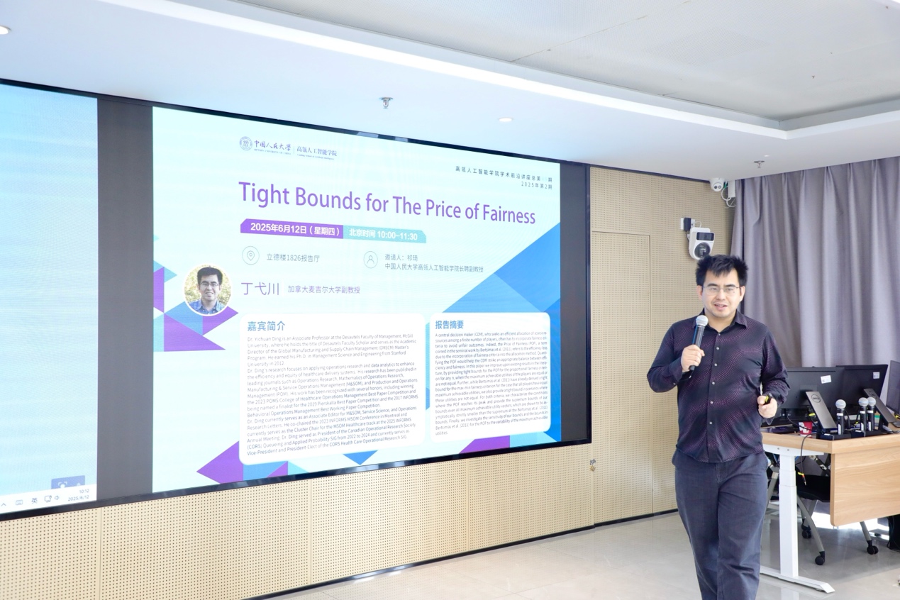 2025年6月12日,中国人民大学高瓴人工智能学院迎来了一场聚焦资源分配公平性与效率平衡的深度学术交流。加拿大麦吉尔大学副教授、德桑特尔荣誉学者丁弋川应邀访问,以“Tight Bounds for The Price of Fairness”为主题展开前沿报告,为师生揭示了公平准则在资源分配中的理论边界与实践意义。