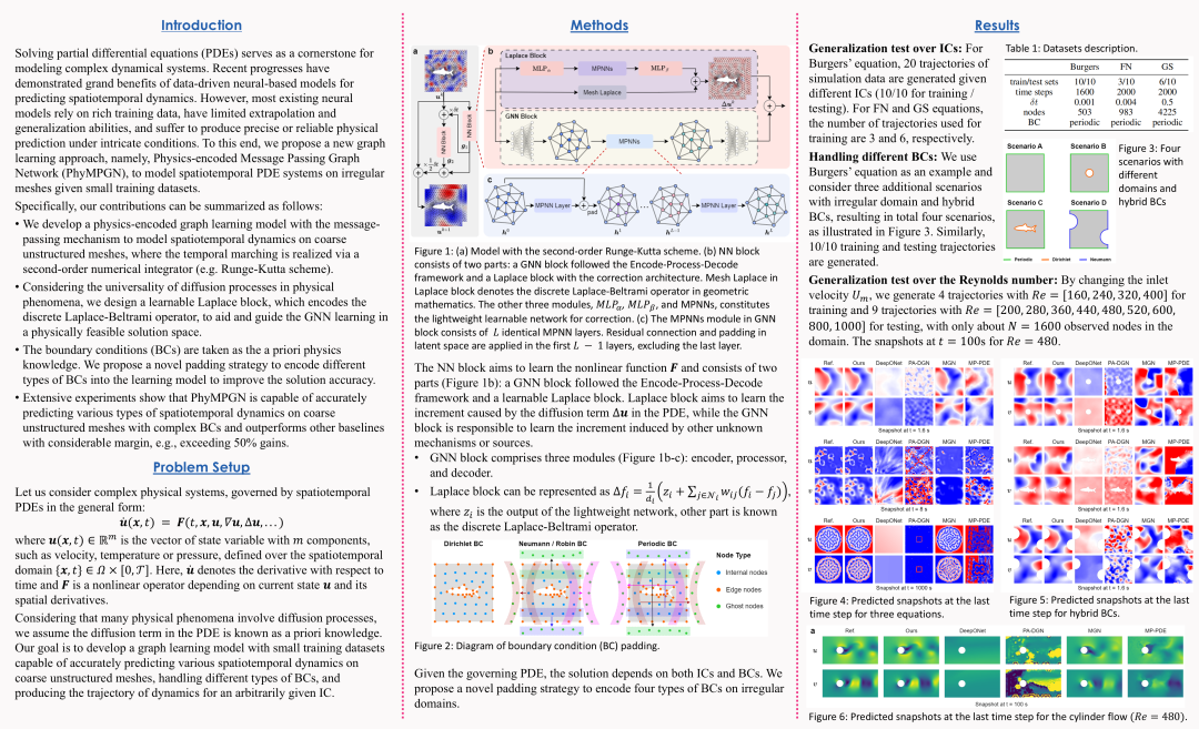博士生曾博成宣讲了论文 “PhyMPGN: physics-encoded message passing graph network for spatiotemporal PDE systems”,他坦言:“在会议现场亲眼见到各个领域的大佬,与他们交流让我受益匪浅。Poster 环节与其他论文作者的直接对话,解决了我的诸多疑惑,同时也为我的研究提供了新的思路和建议。不过,在与外国学者交流的过程中,我也暴露出了英语口语能力的不足,这提醒我在今后要针对性地提高语言能力。”