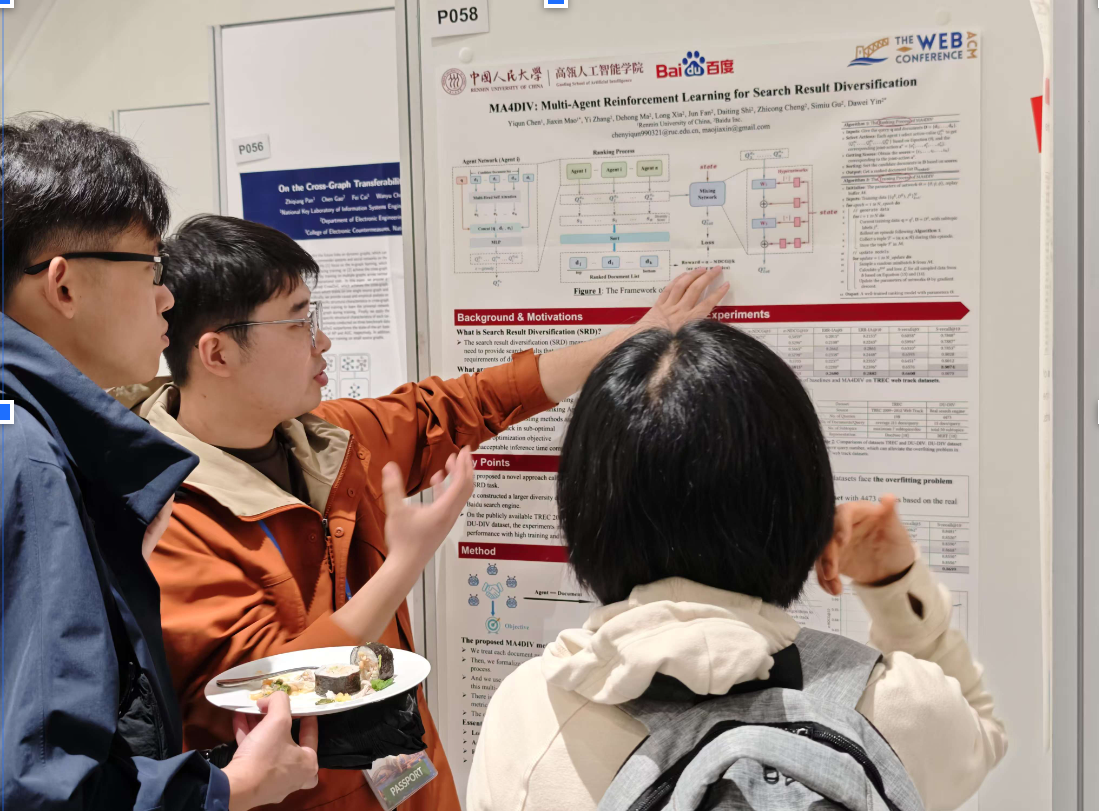博士研究生董冠霆作为第一作者去WWW 2025 Posterboard-16讲解了他的DPA-RAG论文。他说:“在出国交流期间,我分享了关于DPA-RAG的研究工作,探讨了如何对齐大模型与检索器的知识偏好。交流过程中,我结识了国内外AI信息检索领域的多位研究者,包括来自阿里巴巴、蚂蚁集团、Google、新加坡国立大学(NUS)等机构的专家,借此了解到当下前沿的AI研究方向,进一步拓宽了自己的科研视野。”