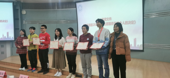 党委学工部张震老师宣读了《关于表彰2021年度志愿服务先进个人的决定》。会议现场为获奖志愿者代表颁发奖杯和荣誉证书。第22届支教队员刘柯同学作为优秀志愿者代表发言,他分享了自身志愿服务经历中的两个小故事,讲述了成为一名志愿者后所带来的变化和感想,希望与同学们一道接力做好志愿服务工作。