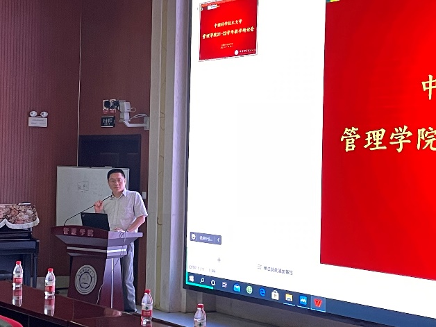 管理学院执行院长余玉刚对学院近年来教学及科研工作进行总结。他指出,管理学院近年来在教学活动规范化、信息化方面取得长足进步,不断扩大生源入口,在教学课程改革、教材专著完善、学生发展等课程培养的各个方面均显著提升。同时,他也就学院部分教学项目、生源优化、师资引进等方面的工作进行了深入剖析,指出现有不足及发展方向,鼓励全体教师围绕立德树人根本任务勇担重任,为创建中国特色世界一流大学贡献力量。
