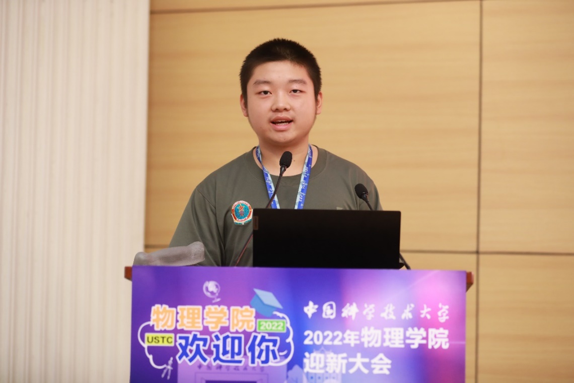 陈宇翱代表物理学院致欢迎辞。他指出,中国科大是一所拥有家国情怀和光辉历史的学校,严济慈、华罗庚、赵忠尧、赵九章等为代表的老一辈科学家们爱国奉献的精神和严谨求实、刻苦钻研的治学态度激励了一代代科大学子。陈宇翱回忆起在科大的岁月,近年来“小而精”的科大在不断升级学习和生活条件的同时,科研和学术氛围更是浓厚。他希望同学们把科大当作自己的家,积极融入科大。他强调一定要打好数理基础,正如习近平总书记所说,“禾苗在地里墩一墩,才能吃土更深、扎根更实,在风雨中抗倒伏、立得住”,陈宇翱嘱咐同学们规划好自己的目标,踏踏实实走好每一步,学好每一门课程,培养自己独立的科学思维能力,珍惜并充分利用好大学的时光,用责任和梦想去重塑心中的象牙塔。