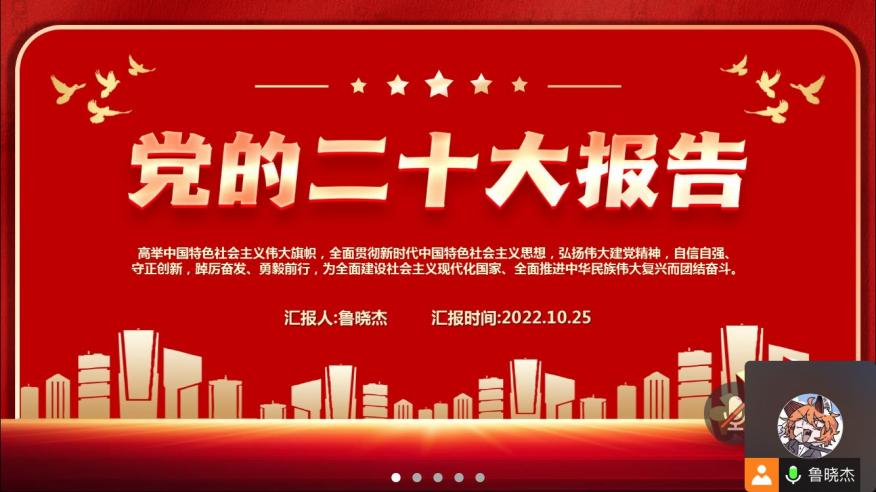 中国共产党第二十次全国代表大会,是在全党全国各族人民迈上全面建设社会主义现代化国家新征程、向第二个百年奋斗目标进军的关键时刻召开的一次十分重要的大会。为深入学习大会精神,合肥微尺度物质科学国家研究中心2019级硕士博士2班于10月25日召开线上会议,集中学习党的二十大报告,主讲人为鲁晓杰同志。