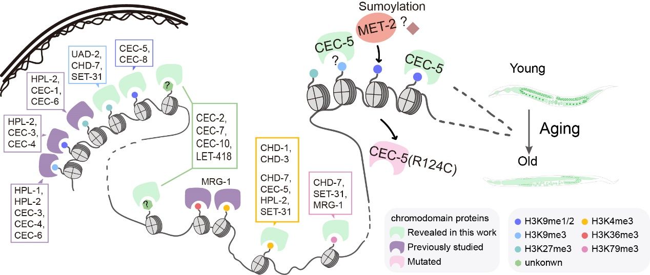 研究人员应用CRISPR/Cas-9基因编辑、染色质免疫共沉淀测序、荧光成像等研究手段,系统性注释了秀丽线虫Chromo结构域蛋白的表达谱和染色质结合谱。随后,研究人员使用Chromo结构域蛋白的亚细胞定位作为报告体系,通过遗传筛选和体外实验鉴定了一个H3K9me1/2阅读器CEC-5,并发现了CEC-5中一个在人类与秀丽线虫间保守的氨基酸位点,该氨基酸位点不但对CEC-5识别、结合异染色质至关重要,而且参与了秀丽线虫的寿命调控。有意思的是,课题组在2022年(Elife 2022)对一系列可能的组蛋白甲基转移酶(SET)突变体线虫进行了寿命分析,并发现了一类与H3K9甲基化修饰相关的set基因,其缺失可以显著延长daf-2突变体线虫的寿命,并增强其抗压力应激能力。H3K9me1/2阅读器CEC-5的发现为未来Chromo结构域蛋白的研究奠定了基础,也为进一步探索异染色质与寿命的关系提供了新的思路。