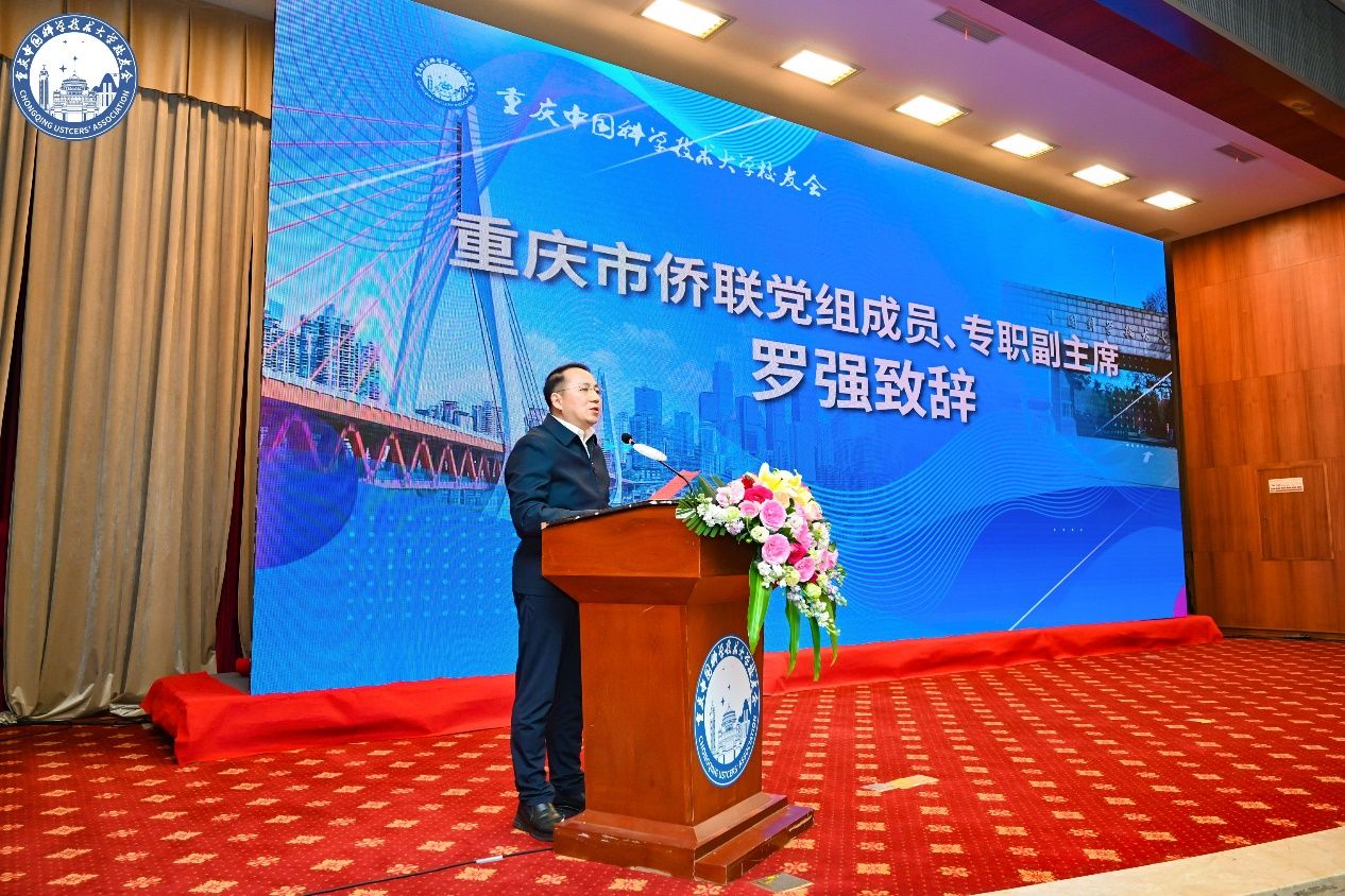 罗强代表重庆市侨联致辞,向本次活动与会嘉宾表示了衷心祝贺和热烈欢迎、向科大校友一直以来对重庆发展的大力支持表示最衷心的感谢。他希望中国科大一如既往地关注和支持重庆发展,结合重庆“416”科技创新战略布局和“33618”现代制造业集群体系建设,与重庆建立更经常、更紧密的联系。希望重庆中国科大校友会能成为重庆与海内外科大校友的桥梁和纽带,与市侨联一起创新合作引才机制,做好中国科大侨界专家学者服务工作。希望广大校友能将重庆市侨联服务侨界专家学者的一片赤诚宣传出去、传播开来,吸引更多的侨界人才关注重庆、创业重庆。