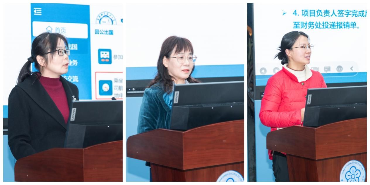 国际合作与交流部李领和陈晨玮分别介绍了2023年我校因公出、来访相关情况,并对重点政策和常见问题进行了详细说明。国际合作与交流部张夏菲结合本年度因公出访审批工作中相关案例,解读了审批流程中的关键环节和注意事项,为大家的实际操作提供了有益的参考和指导。