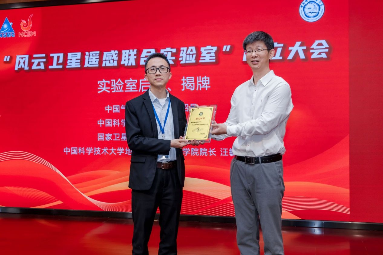 此外,作为联合实验室的重要设备支撑,中国气象局向中科大捐赠了“风云降水星数据接收处理系统”一套,用于建设“风云卫星数据地面接收站”,并由王劲松主任代表中国气象局国家卫星气象中心向汪毓明院长转交赠送证书。