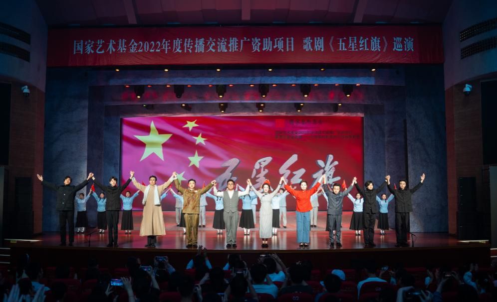 歌剧《五星红旗》由温州市委宣传部、温州大学、瑞安市委联合出品,它以五星红旗的诞生为主线,讲述了温州大学校友曾联松参加革命工作的经历以及新中国成立前夕在上海设计国旗的曲折历程,歌颂其个人情感抉择与家国命运紧密相连、勇于担当、矢志不渝的革命精神与爱国情怀,展现了中国青年在中国共产党的领导下为争取民族独立、人民解放而书写的壮丽篇章。
