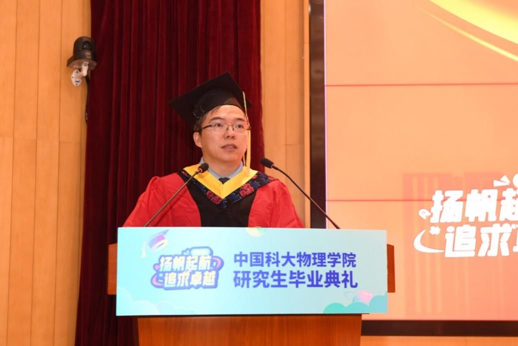 物理学院执行院长陈宇翱在致辞中表示,同学们在科大度过了一段人生中宝贵而难忘的时光,在学术的追求中磨练意志,在师友的陪伴中收获成长,用勤奋和汗水浇灌着梦想,用智慧和勇气攀登着科研高峰。