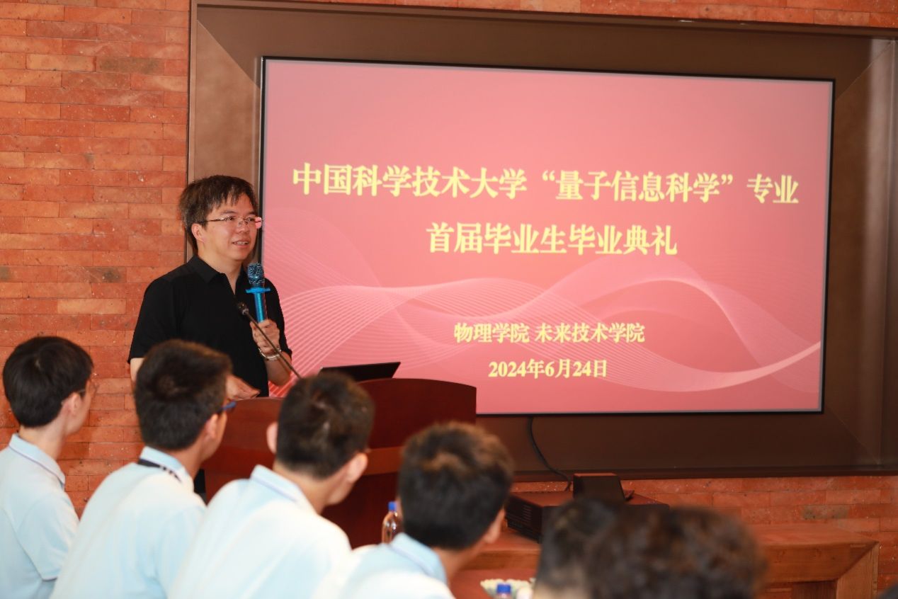 陈宇翱首先向毕业生们表达了热烈的祝贺,他将自己的科研经历娓娓道来,向同学们分享了科研道路上遇到的挫折和克服困难的经验感受。他表示,当前,量子科学与技术的研究已经被我国和国际上的主要发达国家提升到国家战略的高度,同学们作为我国首批量子信息科学专业本科毕业生,抓住机遇,不负韶华,顺利完成学业并实现百分百继续深造。在未来,应努力担当起时代赋予的使命与责任,为我国量子信息科学的发展贡献自己的力量。