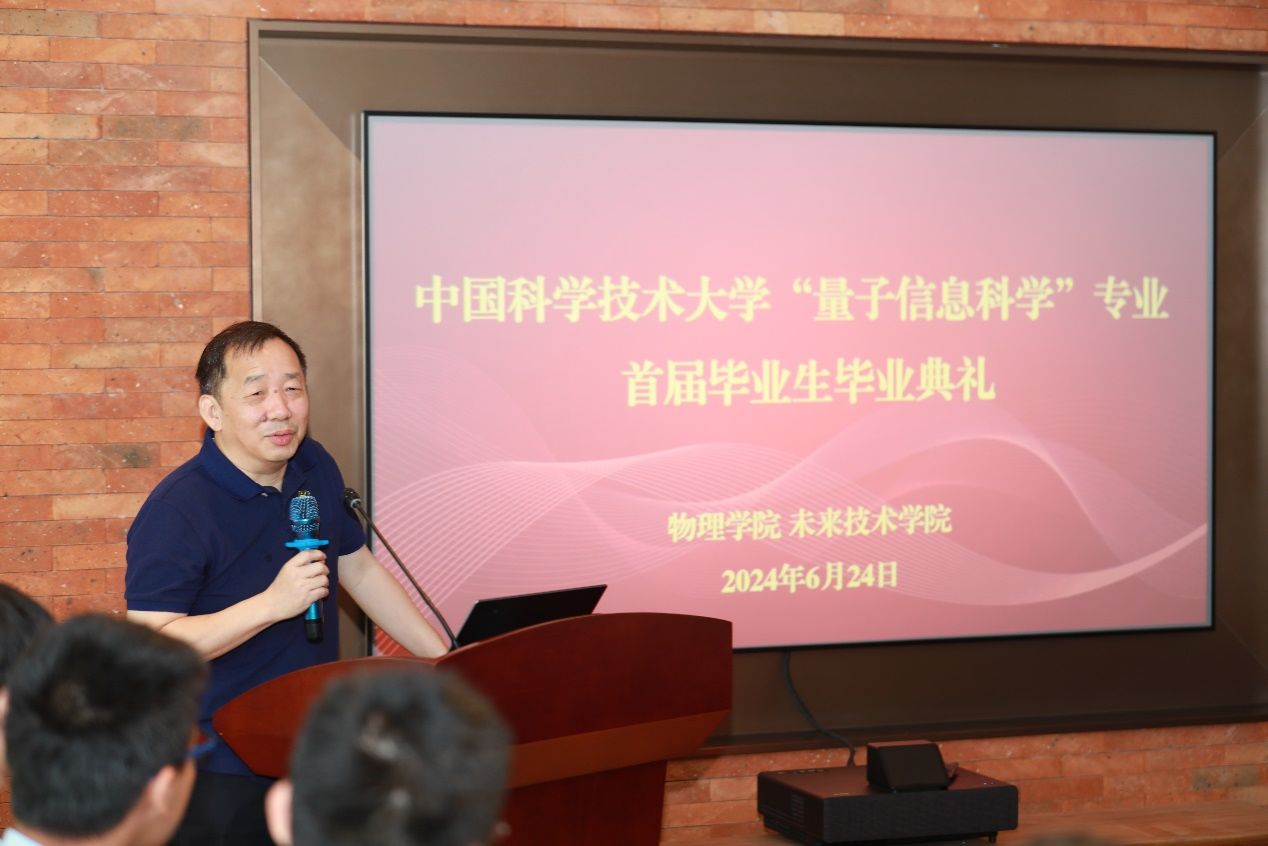 6月24日上午,我校物理学院和未来技术学院联合举办首届量子信息科学专业本科生毕业典礼。物理学院执行院长陈宇翱、党委书记周正威,未来技术学院执行院长罗毅,物理学院党委副书记张永生、导师代表陈向军教授等及全体量子信息科学专业毕业生出席仪式。仪式由物理学院党委副书记凌锋主持。