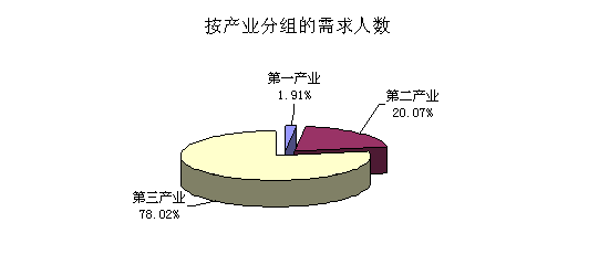 从产业需求来看:第三产业所需劳动力比重本季度为78.02%,比去年二季度增长27个百分点,第一产业、第二产业用工需求比例分别为1.91%、20.07%,第二产业劳动力需求量较去年同期的25.61%下降5.55个百分点,同比已连续两年出现三产需求增加,二产需求回落的情况。