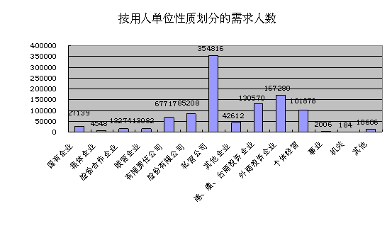 从用人单位性质来看:私营公司、港澳台商投资企业、外商投资企业为用工需求量前三位的用人单位,用工需求量分别占需求总量的38.44%、14.85%、14.40%,内资企业需求总量为79万人次,所占比重达到75.17%。
