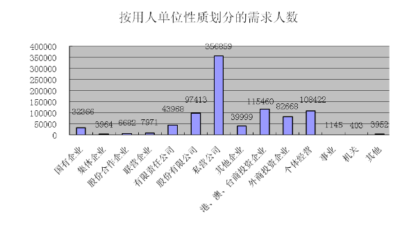 从用人单位性质来看:私营公司、港澳台商投资企业、个体经营为用工需求量前三位的用人单位,用工需求量分别占需求总量的39.6%、12.81%、12.03%,内资企业需求总量为58.92万人次,所占比重达到65.38%。