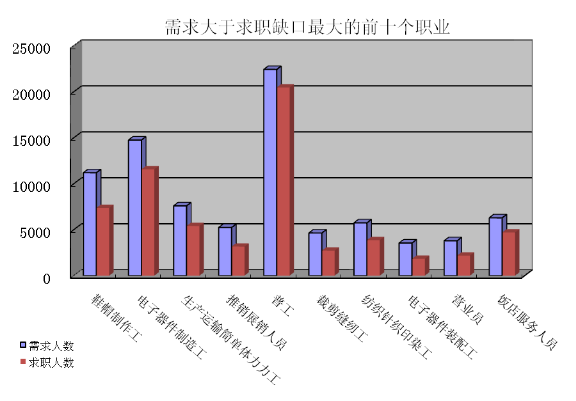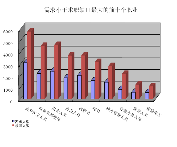 一是求大于供岗位(工种):鞋帽制作工、电子器件制造工、生产运输简单体力力工市场登记缺口分别是3823人次、3191人次、2184人次。二是供大于求岗位(工种):治安保卫人员、机动车驾驶员、财会人员的市场登记缺口分别是-2658人次、-2369人次、-2246人次。