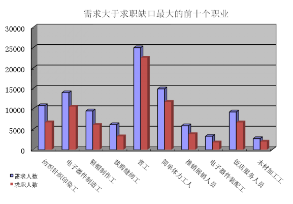 一是求大于供岗位(工种):纺织针织印染工、电子器件制造工、鞋帽制作工的市场登记缺口分别是4101人次、3415人次、3411人次。二是供大于求岗位(工种):秘书、治安保卫人员、机动车驾驶员的市场登记缺口分别是-2791人次、-2472人次、-2130人次。