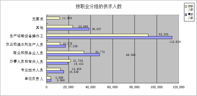 本季度职业供求总量为46.84万人次,同比上升10.39%,环比下降4.44%。其中:岗位需求登记25.65万人次,同比上升9.52%,环比下降3.85%;求职登记21.19万人次,同比上升10.28%,环比下降5.14%。