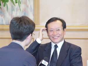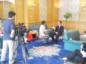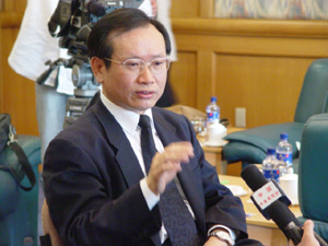 黄淑和在会议间歇接受中央电视台等多家媒体采访