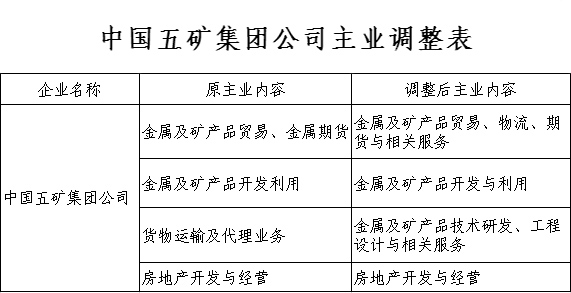 为进一步突出企业主业,实现企业的持续、健康、科学发展,依据《中华人民共和国公司法》和《企业国有资产监督管理暂行条例》(国务院令第378号),结合企业发展情况,我委对中国五矿集团公司的主业调整进行了审核确认,现予以公布。