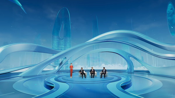 值得一提的是,三家运营商在本次活动中充分发挥数智化技术方面的经验和优势,主导实现了活动展现形式的创新突破。本次活动以数字时代标志产物“元宇宙”作为视觉呈现核心,以XR扩展现实技术为依托,呈现出未来城市设计的活动现场,描绘出超高速传输技术加持下的美好生活前景。会场空间无限延展,现场嘉宾融入元宇宙虚拟场景之中,呈现出极具科技感和前沿感的视觉感官体验。此外,本次活动的主持人是一位采用实时渲染技术生成的虚拟数智主持人,通过运用先进的Vicon光学动作捕捉系统、Axiom实时内核与高性能算法,实现虚拟人与真人嘉宾的实时互动。用心的设计和大胆的创新突破,向广大投资者直观展示了运营商数智化转型的发展成果和应用场景。