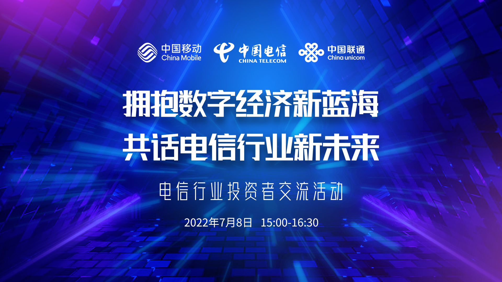 7月8日,中国移动、中国电信、中国联通三家电信运营商携手亮相,联合举办了电信行业上市公司投资者交流活动。这是三家电信行业上市公司齐聚A股后,深入贯彻党中央、国务院决策部署,认真落实国务院《关于进一步提高上市公司质量的意见》,积极响应国资委《提高央企控股上市公司质量工作方案》的具体举措。本次活动是央企同行业上市公司联合组织投资者交流活动的首次实践,也是运用前沿技术创新投资者交流形式的首次尝试,非常具有突破性和创新性。