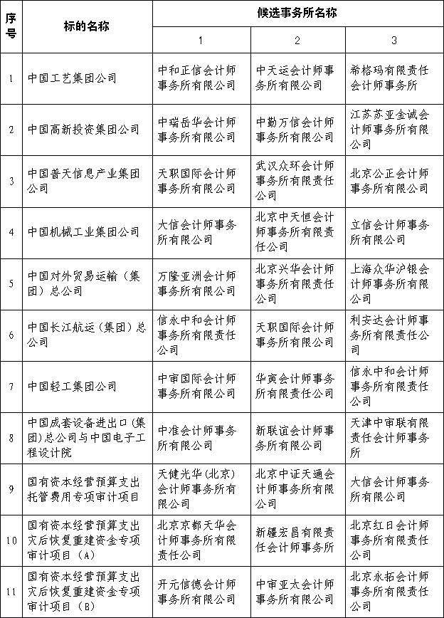 根据国务院国有资产监督管理委员会2009年中央企业审计项目比选公告,2009年8月7日上午,三峡国际招标有限责任公司按规定程序组织开展标的选取工作,在北京市长安公证处公证员的全程监督下,30家符合资格条件的入围会计师事务所按规定进行了标的选取,现将结果公告如下: