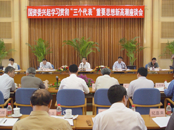 国务院国有资产监督管理委员会兴起学习贯彻“三个代表”重要思想新高潮座谈会6月27日在京召开。国资委党委书记、副主任李毅中强调,中央企业各级党组织要认真贯彻党中央关于在全党兴起学习贯彻“三个代表”重要思想新高潮的决定,加强领导,精心组织,作为一项首要的政治任务切实抓好,把思想和认识统一到“三个代表”重要思想和党的十六大精神上来,把智慧和力量凝聚到深化国有资产管理体制改革和推进中央企业改革发展稳定的各项工作上来。