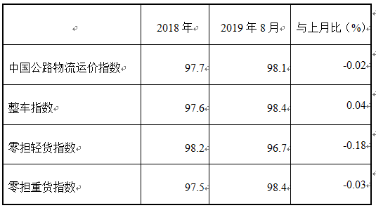 2019年8月份,由中国物流与采购联合会和林安物流集团联合调查的中国公路物流运价指数为98.1点,与上月相比波动幅度较小,环比回落0.02%,但比去年同期增长2.5%。月内各周指数运行总体平稳,波动幅度在980点至981点之间。