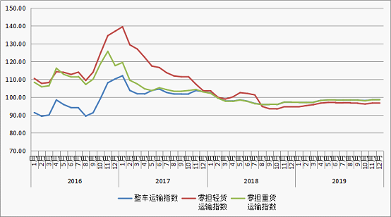 分车型指数看,各车型指数环比均有所回升,同比继续保持增长。其中,以大宗商品及区域运输为主的整车指数为98.7点,比上月回升0.1%,比上年同期回升1.7%。零担指数中,零担轻货指数回升幅度高于零担重货指数,零担轻货指数为96.8点,比上月回升0.13%,比上年同期回升2.4%;零担重货指数为98.6点,比上月回升0.1%,比上年同期回升1.6%。