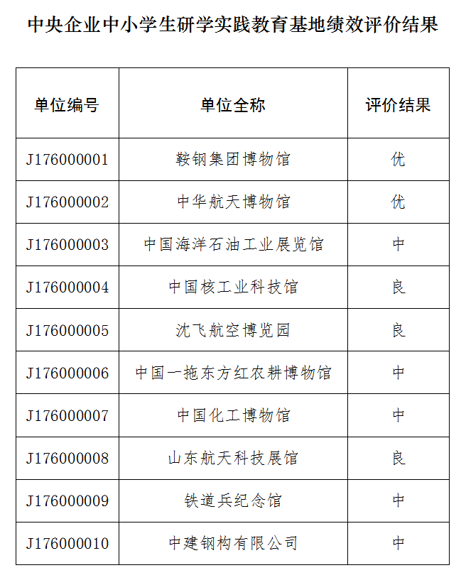 按照《教育部办公厅关于做好2019年度中央专项彩票公益金支持未成年人校外教育项目支出绩效评价工作的通知》(教基厅函〔2020〕12号)要求,我们对鞍钢集团博物馆等10家中央企业中小学生研学实践教育基地开展了绩效评价工作,现将结果予以公示。