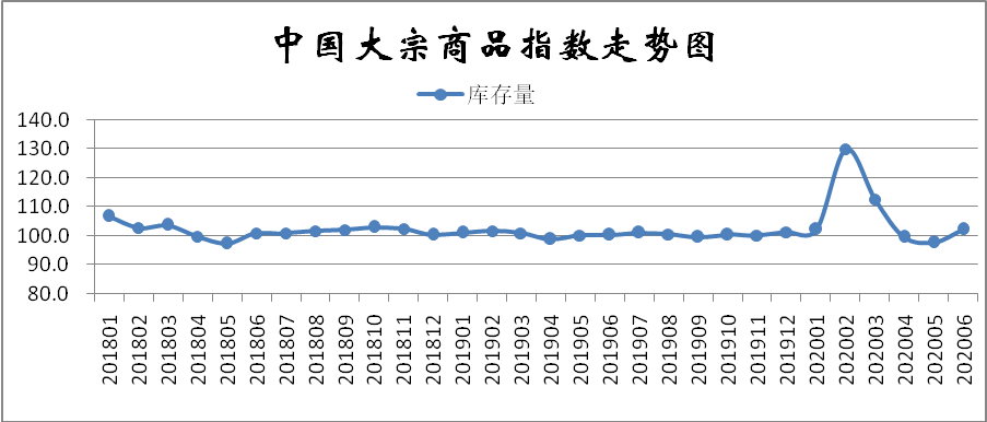2020年6月份,大宗商品库存指数止跌反弹,至102.3%,较上月回升4.6个百分点,该指数在连续两个月回落后,本月出现反弹,显示商品库存开始累积,库存压力加大。各主要商品中,钢铁、铁矿石、煤炭、成品油和有色金属库存量均出现止跌回升的态势,化工和汽车库存量则继续上升,且增速和上月相比均有所加快。