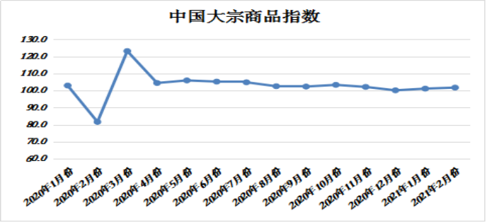 由中国物流与采购联合会调查、发布的2021年2月份中国大宗商品指数(CBMI)为101.7%,较上月上升0.6个百分点。各分项指数中,供应指数、库存指数继续上升,销售指数则持续下降。从本月指数的变化情况来看,该指数继续上升仍是受代表供应端的供应指数和库存指数持续上升拉动所致,本月国内大宗商品市场受春节因素影响较为明显,终端需求基本停滞,供需失衡的格局继续显现,商品库存仍在积压,市场运行压力较大。进入3月以后,下游需求将迎来快速复苏,市场供需矛盾有望得到缓解,进而支撑价格上涨。不过面对生产企业产能持续释放以及库存高企等因素,供给端压力也较为明显,价格上行或存在一定的阻碍。