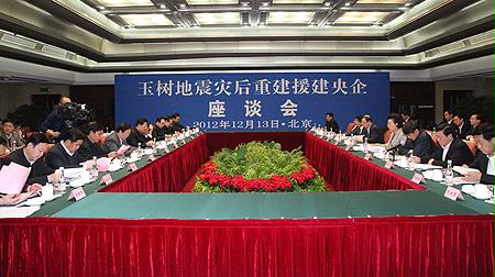 12月13日,国务院国资委与青海省政府在京联合召开玉树地震灾后重建援建央企座谈会。国资委主任王勇,青海省委书记强卫,国资委副主任黄丹华出席会议并分别讲话,青海省省长骆惠宁主持会议,青海省常务副省长徐福顺通报重建工作进展情况。国资委副秘书长郭建新出席会议。