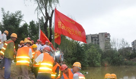 7月5日上午9点,武汉蔡甸消泗出现险情,水位已淹没桥面。中建幕墙有限公司15分钟组织了一支120人的抗洪队伍。有的人没有分到雨衣、雨靴,雨水、汗水、泥水浸透了他们的衣背。沙石在大家的密切配合下一袋袋迅速填充。截至记者发稿时,中国建筑累计出动救援力量5000余人次,动用自卸车、挖掘机、铲车等大型机械设备490余台。