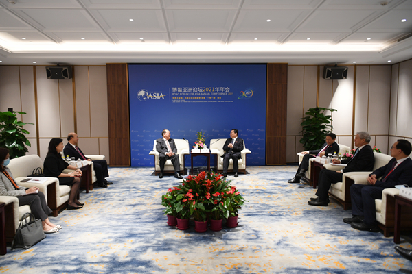 4月20日,国务院国资委党委书记、主任郝鹏在出席博鳌亚洲论坛2021年年会期间会见了澳门特别行政区行政长官贺一诚。双方就进一步推动中央企业助力澳门经济适度多元发展,参与粤澳(横琴)深度合作区、粤港澳大湾区建设等进行了深入交流。外交部驻澳门特别行政区特派员公署特派员刘显法,国务院国资委党委委员、秘书长彭华岗参加会见。