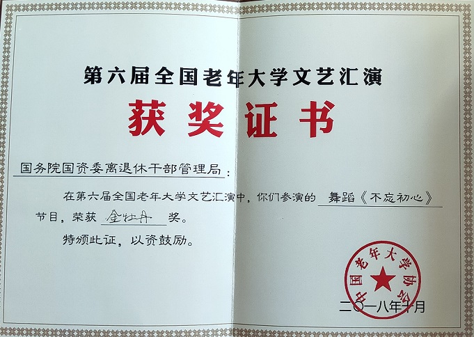 由刚刚参演了国资委离退休干部庆祝改革开放40周年“新时代 新征程”文艺演出的舞蹈《不忘初心》的全体演职人员组成国资委离退休干部代表队,再踏征程,辗转数千公里参加了本次汇演,并在众多的参演艺术团队中,经过多轮选拔,技压群雄、脱颖而出,最终夺得了一等奖--金牡丹奖的好成绩。