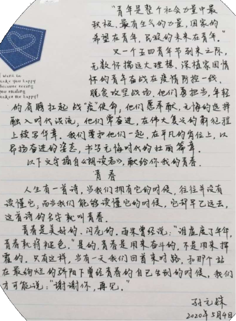 今年五四期间,国资委机械离退局团支部开展了“绽放战疫青春·坚定制度自信”主题笔谈活动,组织全局40岁以下青年同志参加,通过亲笔书写心得体会,交流青年同志在参与疫情防控期间的所感所思,并以硬笔书法展评的形式,将青年同志的战疫体会向全局同志展示。