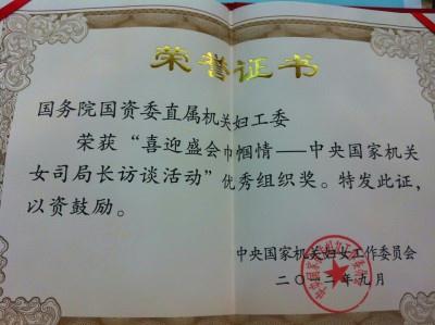 在9月28日上午召开的“喜迎盛会巾帼情——中央国家机关女司局长访谈活动”总结会上,国资委直属机关妇工委喜获“中央国家机关女司局长访谈活动”优秀组织奖。全国妇联党组成员、书记处书记范继英,中央国家机关工委副书记姚志平,中央国家机关工委统战(群工)部部长谈宜彦等领导同志为获奖单位颁奖。国资委直属机关妇工委主任、巡视组副组长徐华参加会议并代表国资委直属机关妇工委领奖。