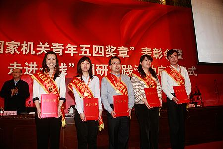 5月3日下午,中央国家机关工委隆重举行“中央国家机关青年五四奖章”表彰大会暨“根在基层 走进一线”调研实践活动启动仪式。我委财务监督与考核评价局企财一处处长王海琳同志荣获“中央国家机关青年五四奖章标兵”荣誉称号,外事局主任科员谢晖同志荣获“中央国家机关青年五四奖章”荣誉称号。国务委员兼国务院秘书长、中央国家机关工委书记马凯、中央国家机关工委常务副书记杨衍银等领导同志为获奖代表颁奖,国资委党委委员、副主任、直属机关党委书记黄丹华同志与获奖者所在单位及机关党委负责同志出席了大会。