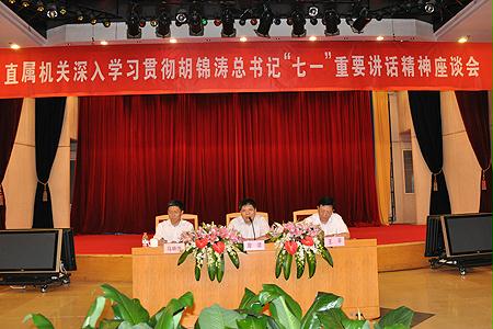 7月26日下午,国资委直属机关召开座谈会学习贯彻胡锦涛总书记“七一”重要讲话精神。国资委直属机关先进基层党组织代表、优秀共产党员代表和优秀党务工作者代表作重点发言,研讨交流学习体会和工作措施。机关各厅局、直属单位、管理局系统、直管协会、部分京外企业在京单位党组织分管宣传工作的负责同志和直属机关党委60余人参加。座谈会由直属机关党委常务副书记曾坚主持。