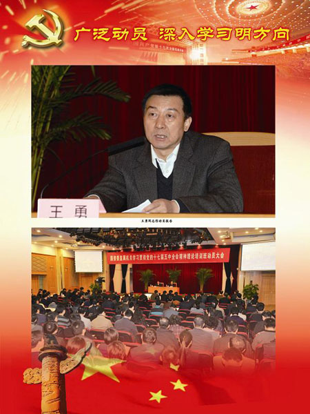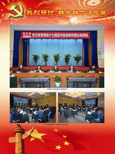为深入学习贯彻党的十七届五中全会精神,准确把握“十二五”期间发展的主题、主线、目标任务和重大举措,总结“十一五”,谋划“十二五”,推进国资委各项工作取得新进展,按照委党委的部署,11月16日至12月9日,在云湖度假村和虎峪园林山庄,举办了4期学习贯彻五中全会精神理论培训班。国资委主任、党委书记王勇为参加1-4期培训班的全体同志作动员报告,委领导黄淑和、黄丹华、孟建民、贾福兴同志,副秘书长杜渊泉、阎晓峰、郭建新同志和机关全体党员干部及直属事业单位、管理局系统党政领导班子成员,直管协会和部分京外企业在京单位党委负责同志共计1100余人参加了培训。培训期间,王勇同志和黄丹华同志到培训班看望参加培训的同志,并参加小组讨论,听取大家对委里工作的意见和建议,与大家共谋国资监管、央企发展、机关建设的思路和措施。