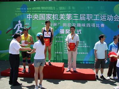 在6月20日结束的中央国家机关第三届职工运动会田径比赛决赛中,国资委机关服务中心姜渝同志以2.47米的成绩获得男子老年组立定跳远决赛第一名、以14秒5的成绩获得男子老年组100米决赛第三名;监事会陈立波同志以2.46米的成绩获得男子老年组立定跳远决赛第二名;中国钢铁协会董莉同志以15秒5的成绩获得女子甲组100米决赛第五名;企干二局方竹同志获得女子青年组100米决赛第十名。